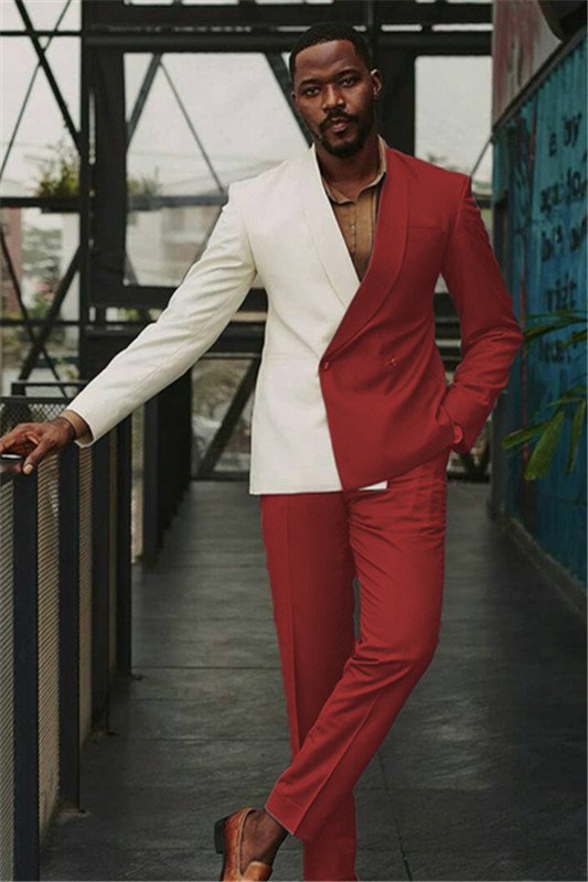 Color Scheme: Featuring a contrasting color-blocking design—the upper body (shoulder and upper part of the suit jacket) is white, while the lower body (jacket hem + trousers) is bright red, creating a strong visual impact and a bold, flamboyant style.