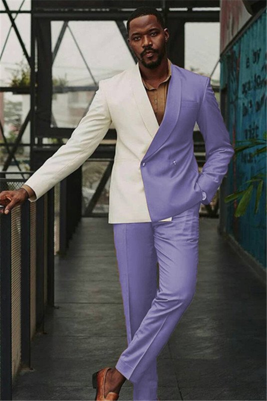 The romance of light purple and the elegance of off-white blend perfectly. The color-blocking breaks the suit's formality, and the exposed chest and casual posture add a touch of dandyish sexiness to the overall look.